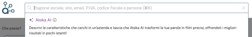 La barra di ricerca di Atoka Sales è stata potenziata con l’introduzione dell’Intelligenza Artificiale. Ora, in aggiunta alla ricerca tradizionale, puoi parlare ad Atoka Sales come se fosse un collega, grazie alla Ricerca Atoka AI in Linguaggio Naturale!