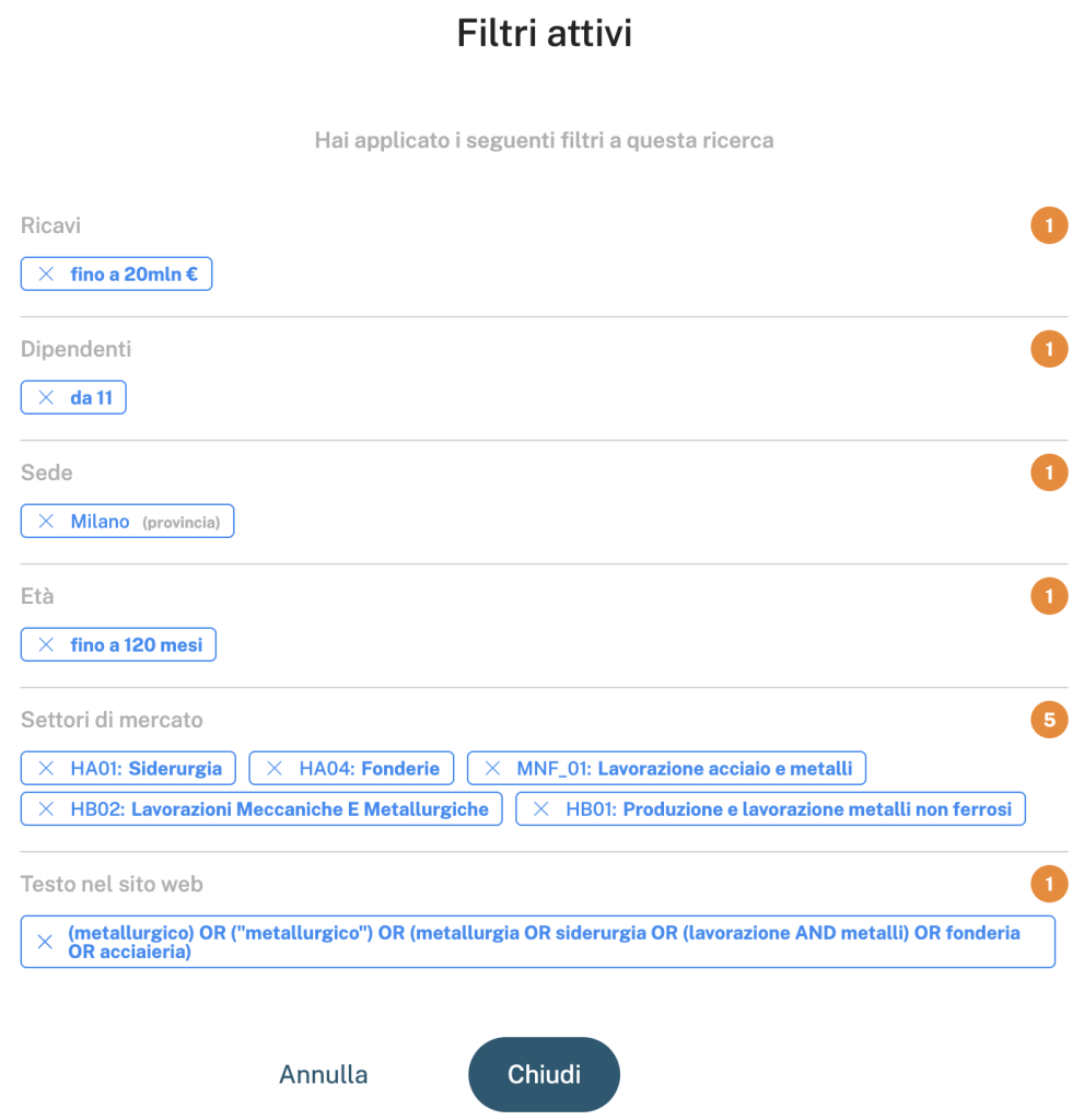 La Ricerca Atoka AI si basa sull’estrazione automatica di concetti e parole chiave da sorgenti ufficiali e digitali. Questo collega ciascuna azienda a settori, attività e specializzazioni, consentendo segmentazioni molto granulari, e mantenendo la possibilità di raffinare manualmente la ricerca dove necessario.
